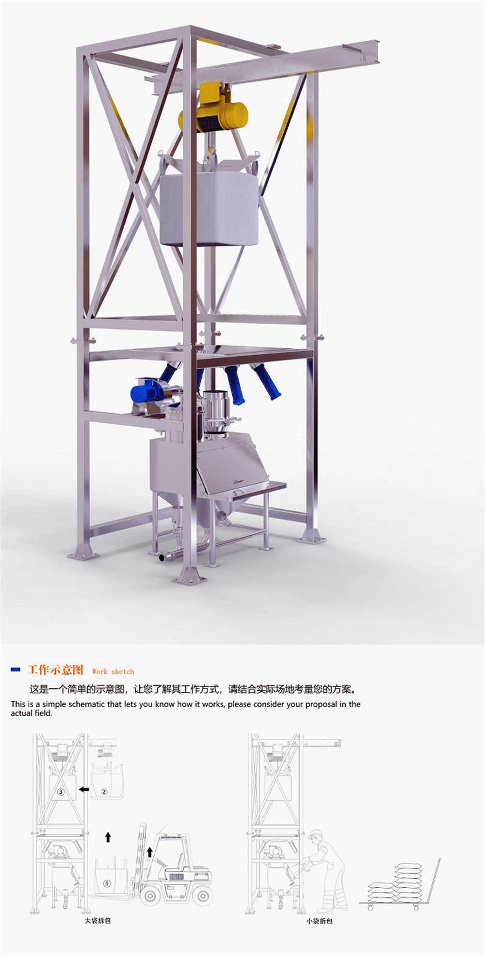 結構噸袋卸料投料站用于噸袋裝粉狀、顆粒狀物料拆包卸料作業。該設備由機架、提升裝置、隔膜閥、暫存料倉等組成;根據工藝特點和設備尺寸,可以采用吊機和叉車兩種不同的方式; 可配有雙軌道,用于兩只電動葫蘆安裝的場合中,提高拆袋效率;材質分為碳鋼和不銹鋼兩種;整套設備密封性好,操作簡便,極大的提高了生產環境和生產效率。