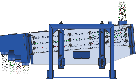設(shè)備的篩箱在慣性力的作用下作前后往復(fù)運(yùn)動(dòng),并帶動(dòng)篩面做周期性搖動(dòng),迫使篩面上的物料隨篩箱一同做定向跳躍式運(yùn)動(dòng),小于篩面孔徑的物料通過(guò)篩框落到下層,稱(chēng)為篩下物,大于篩面孔徑的物料經(jīng)連續(xù)翻滾跳躍運(yùn)動(dòng)后從排料口排出,完成篩分作業(yè)。