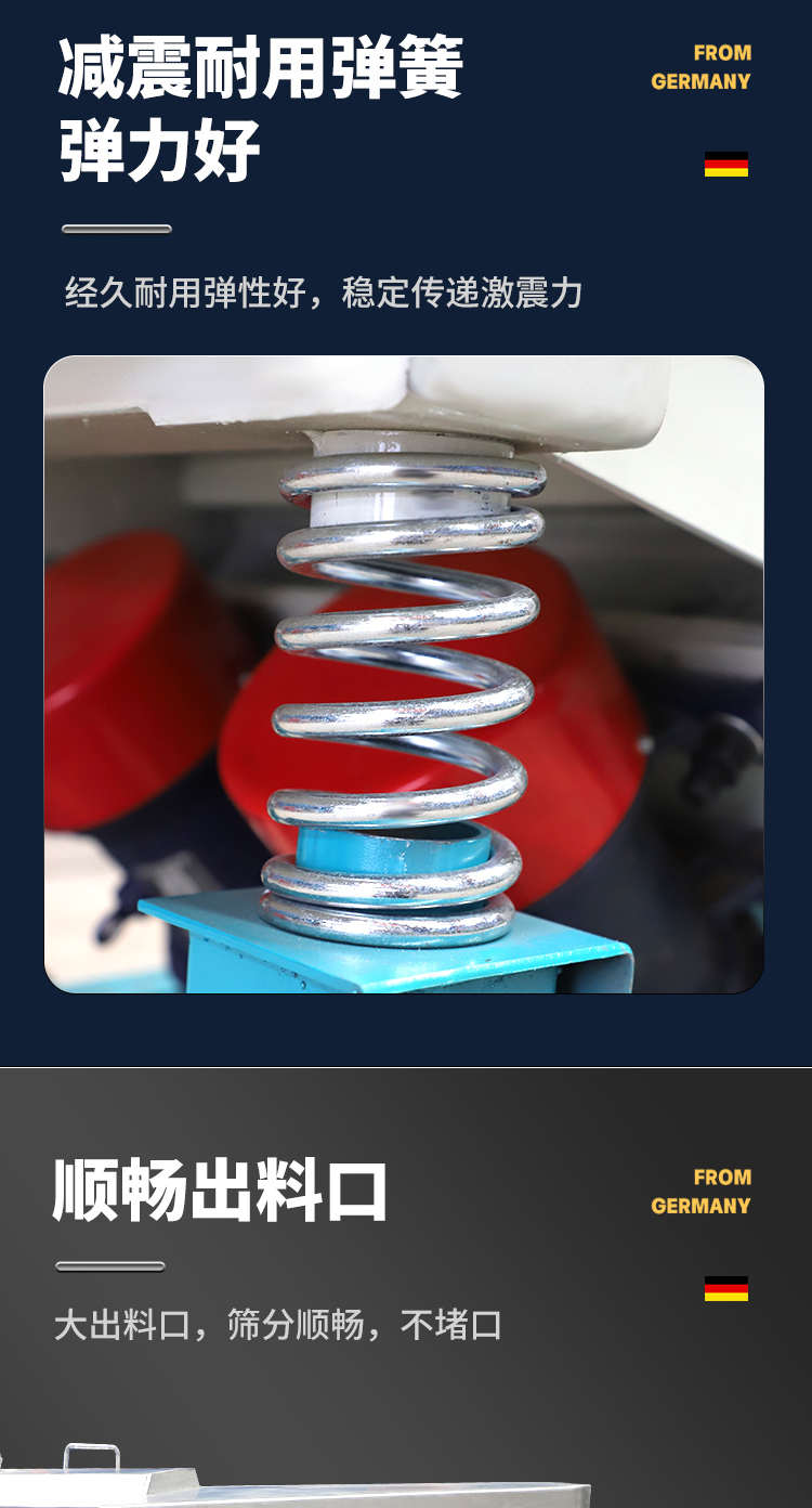 直線振動篩采用雙振動電機驅動,當兩臺振動電機做同步、反缶旋轉時,其偏心塊所產生的激振力在平行于電機軸線的方向相互抵消,在垂直于電機軸的方向疊為一合力,因此振動篩的運動軌跡為一直線。其兩電機軸相對篩面有一傾角,在激振力和物料自重力的合力作用下,物料在篩面上被拋起跳躍式向前作直線運動,從而達到對物料進行篩選和分級的目的。可用于流水線中實現自動化作業。具有能耗低、效率高、結構簡單、易維修、全封閉結構無粉塵溢散的特點。篩分目數325目,可篩分出7種不同粒度的物料。