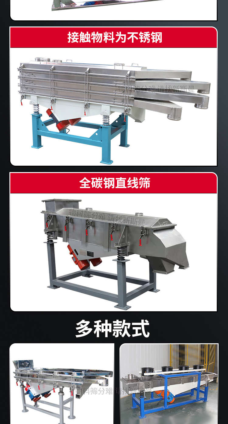 對粉狀、顆粒狀物料的篩選和分級,廣泛應用于塑料、磨料、化工、醫藥、建材、糧食、炭素、化肥等行業.直線振動篩(直線篩)系新型的篩分設備,廣泛用于礦山、煤炭、冶煉、建材、耐火材料、輕工、化工等行業。
