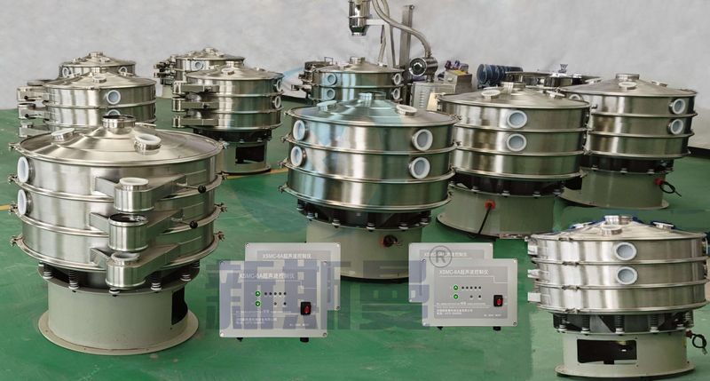 超聲波振動篩是將220V、50Hz或110V、60Hz電能轉化為36KHz的高頻電能,輸入超聲換能器,將其變成36KHz機械振動,產生的功率超聲波使篩網作高頻振動。篩網上的物料在作低頻旋振運動的同時,疊加上超聲振動,既可防止網孔堵塞,又可使篩分機提高產量和質量,從而達到快速篩分和清網的目的,使超微細粉篩分成為易事。該系統在傳統的振動篩基礎上在篩網上引入一個低振幅、高頻率的超聲振動波(機械波),以改變超微細分體的篩分性能。特別適合高附加值精細分體的用戶使用。