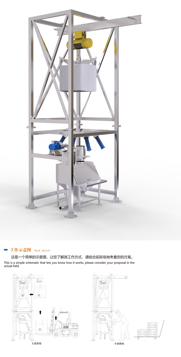 結構噸袋卸料投料站用于噸袋裝粉狀、顆粒狀物料拆包卸料作業。該設備由機架、提升裝置、隔膜閥、暫存料倉等組成;根據工藝特點和設備尺寸,可以采用吊機和叉車兩種不同的方式; 可配有雙軌道,用于兩只電動葫蘆安裝的場合中,提高拆袋效率;材質分為碳鋼和不銹鋼兩種;整套設備密封性好,操作簡便,極大的提高了生產環境和生產效率。