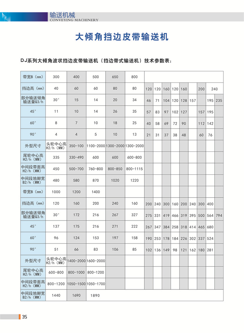 | 型號 | 斜料邊高(mm) | 輸送速度(m/s) | 輸送量(傾角<25度)(m3/h) |