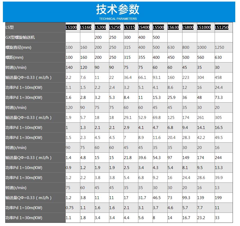 LS型螺旋輸送機結構特征,一臺螺旋輸送機通常由本體、進出裝置、驅動裝置三大部分組成。本體由首節、中間節、尾節三種組成。在首節內裝有支推軸承承受軸向力,在中間節和尾節內裝有用軸承支承螺旋軸,此外,在尾節內還裝有可軸向移動的徑向軸承以補償螺旋軸長度的誤差和適應溫度的變化。各螺旋軸之間采用法蘭式聯接,提高聯接軸的互換性,便于維修。
