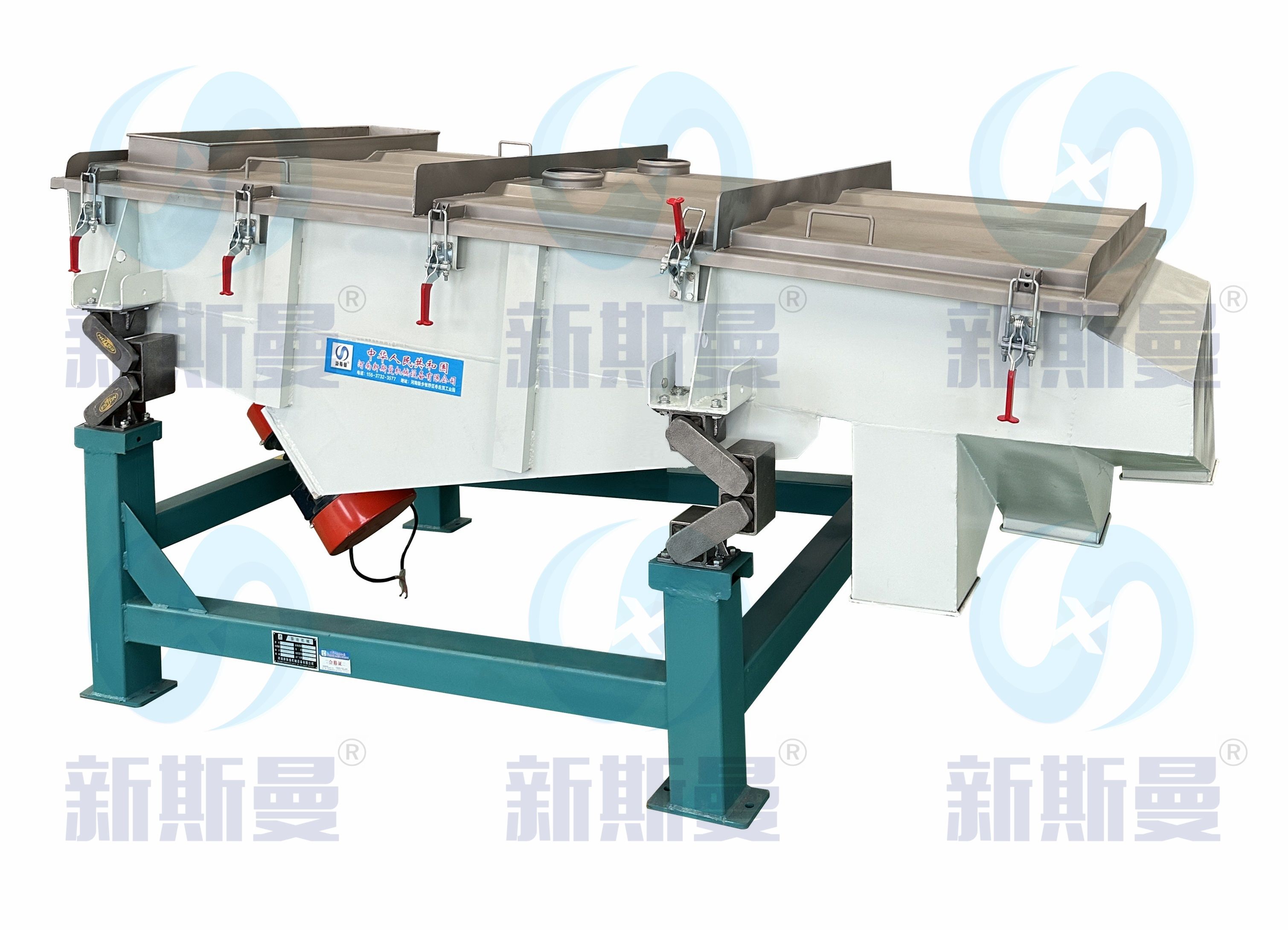 直線振動篩采用雙振動電機(jī)驅(qū)動,當(dāng)兩臺振動電機(jī)做同步、反缶旋轉(zhuǎn)時,其偏心塊所產(chǎn)生的激振力在平行于電機(jī)軸線的方向相互抵消,在垂直于電機(jī)軸的方向疊為一合力,因此振動篩的運(yùn)動軌跡為一直線。其兩電機(jī)軸相對篩面有一傾角,在激振力和物料自重力的合力作用下,物料在篩面上被拋起跳躍式向前作直線運(yùn)動,從而達(dá)到對物料進(jìn)行篩選和分級的目的。可用于流水線中實現(xiàn)自動化作業(yè)。具有能耗低、效率高、結(jié)構(gòu)簡單、易維修、全封閉結(jié)構(gòu)無粉塵溢散的特點(diǎn)。篩分目數(shù)325目,可篩分出7種不同粒度的物料。