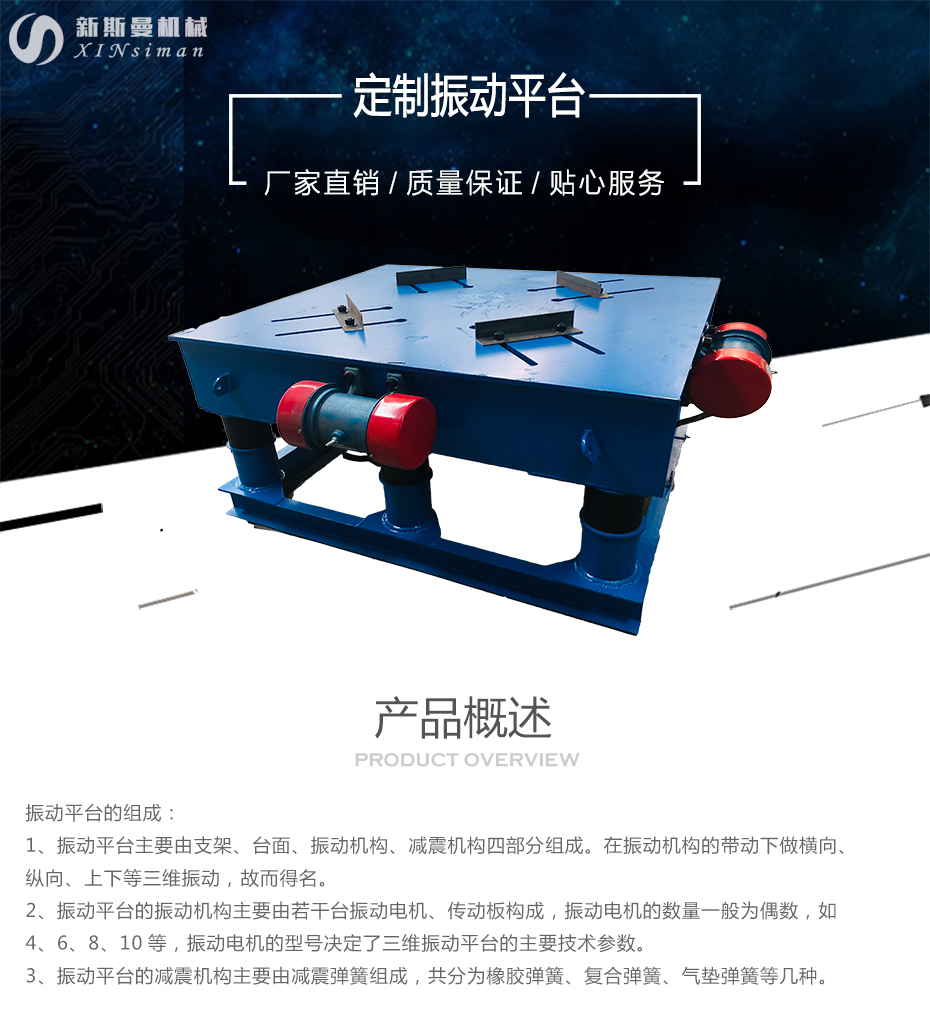 主要由臺底架、振動電機和彈簧等部件組成,臺面與底架均用鋼板和型鋼焊接而成,振動臺是用振動電機加一對相同的偏心輪組成。