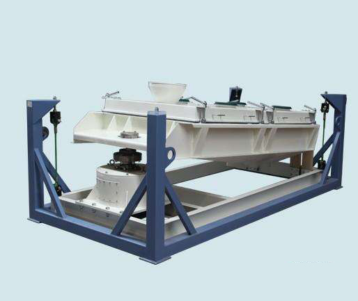 平面回轉(zhuǎn)篩又叫往復(fù)篩,其驅(qū)動(dòng)裝置所產(chǎn)生的振動(dòng)力是繞定軸方向呈一定規(guī)律變化的慣性力,篩機(jī)啟動(dòng)后,篩箱在這一慣性力的作用下作前后往復(fù)運(yùn)動(dòng),帶動(dòng)篩面作圓周性的周期搖動(dòng),從而使篩面上的物料隨篩箱一同作定向跳躍式運(yùn)動(dòng),期間小于篩孔的物料透過(guò)篩孔落入下層篩箱中,成為篩下物,而大于篩孔的物料則在篩面上走過(guò)”S”彎后,在排料口排出,終完成篩分工作。