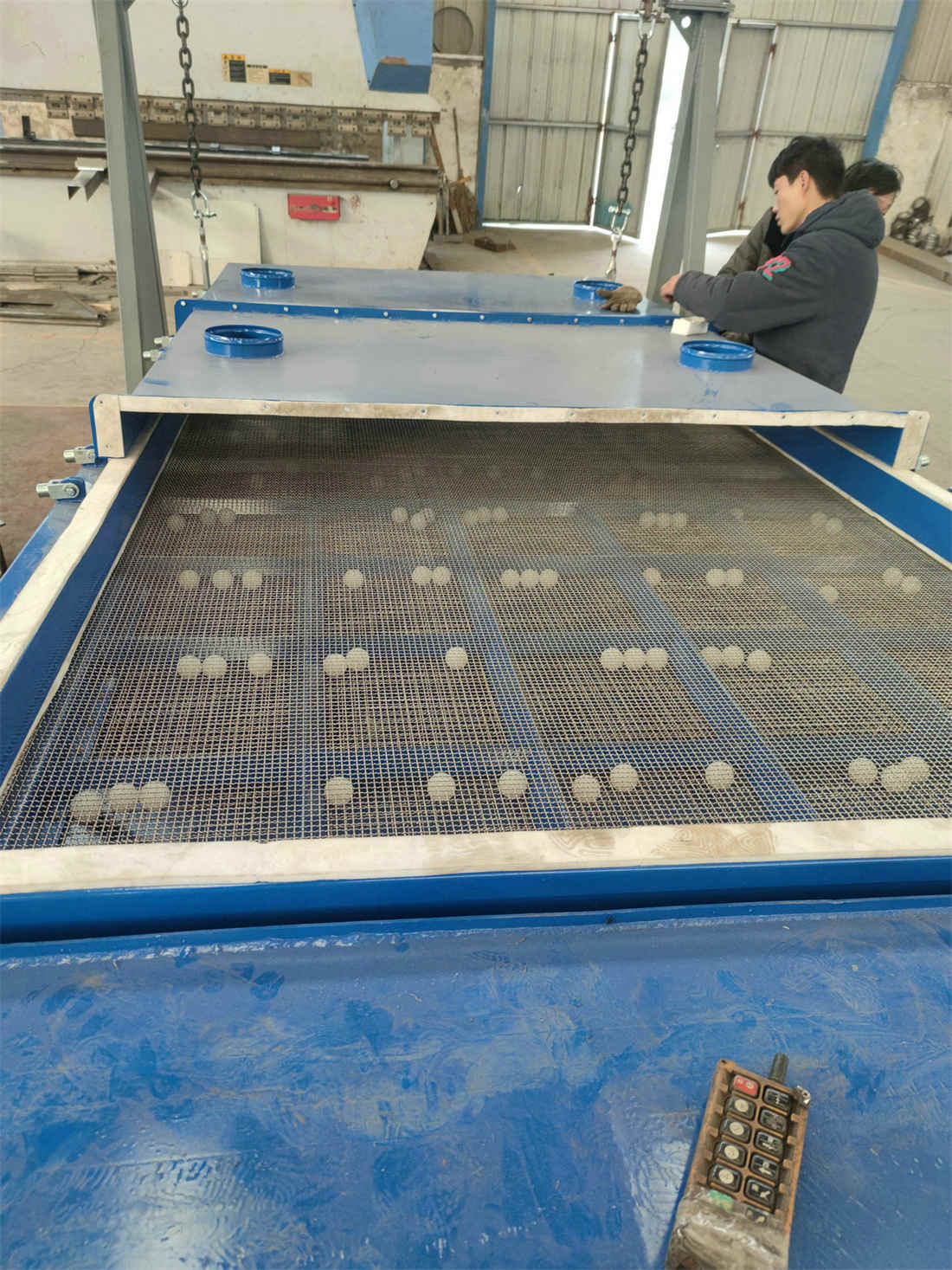 平面回轉(zhuǎn)篩在篩網(wǎng)下方格中的彈跳球通過(guò)直接裝機(jī)篩網(wǎng)來(lái)去除篩網(wǎng)上的顆粒,使篩網(wǎng)表面保持清潔,小球撞擊篩網(wǎng)產(chǎn)生的振動(dòng)有助于物料的分離和粘在一起的顆粒分離。