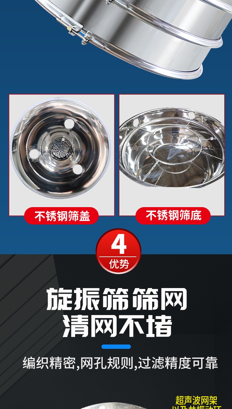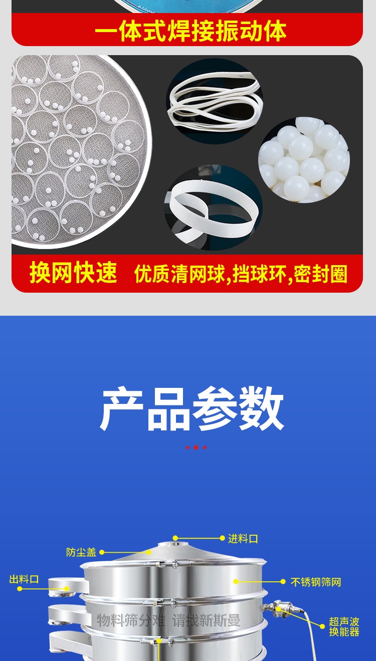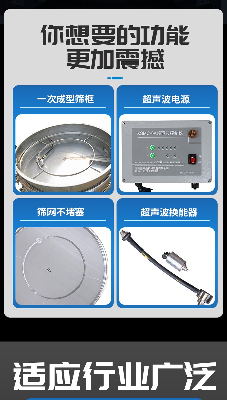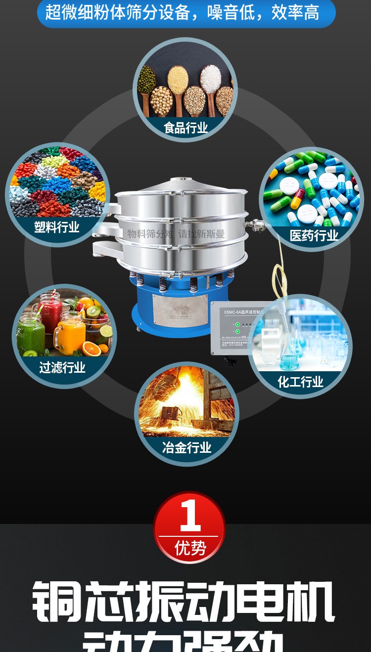 超聲波振動篩是在旋振篩的基礎上引入了超聲波清網裝置,通過將220V、50Hz或110V、60Hz電能轉化為18KHz的高頻電能,輸入超聲換能器,將其變成18KHz機械振動,從而達到高效篩分和迅速清網的目的,使超微細粉篩分成為易事。該系統在傳統的振動篩基礎上在篩網上引入一個低振幅、高頻率的超聲振動波(機械波),以改善超微細粉體的篩分性能。特別適合高附加值精細粉體的用戶使用。超聲波篩分系統是一種簡單實用、可靠的篩分系統,是當前網孔堵塞的有效的解決方法??蓮V泛應用于制藥、冶金、化工、選礦、食品等要求精細篩分過濾的行業,篩分過濾精度高,有效解決因團聚、靜電、強吸附性卡堵網孔等篩分難題,是國內篩分行業的一項重大技術突破。
