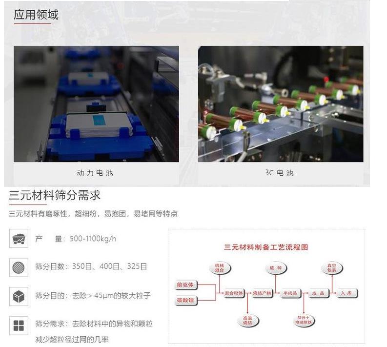 由于超聲波振動在新能源行業的優越表現,在線清網效果明顯,對于比較難篩分的物料有其顯著的效果。