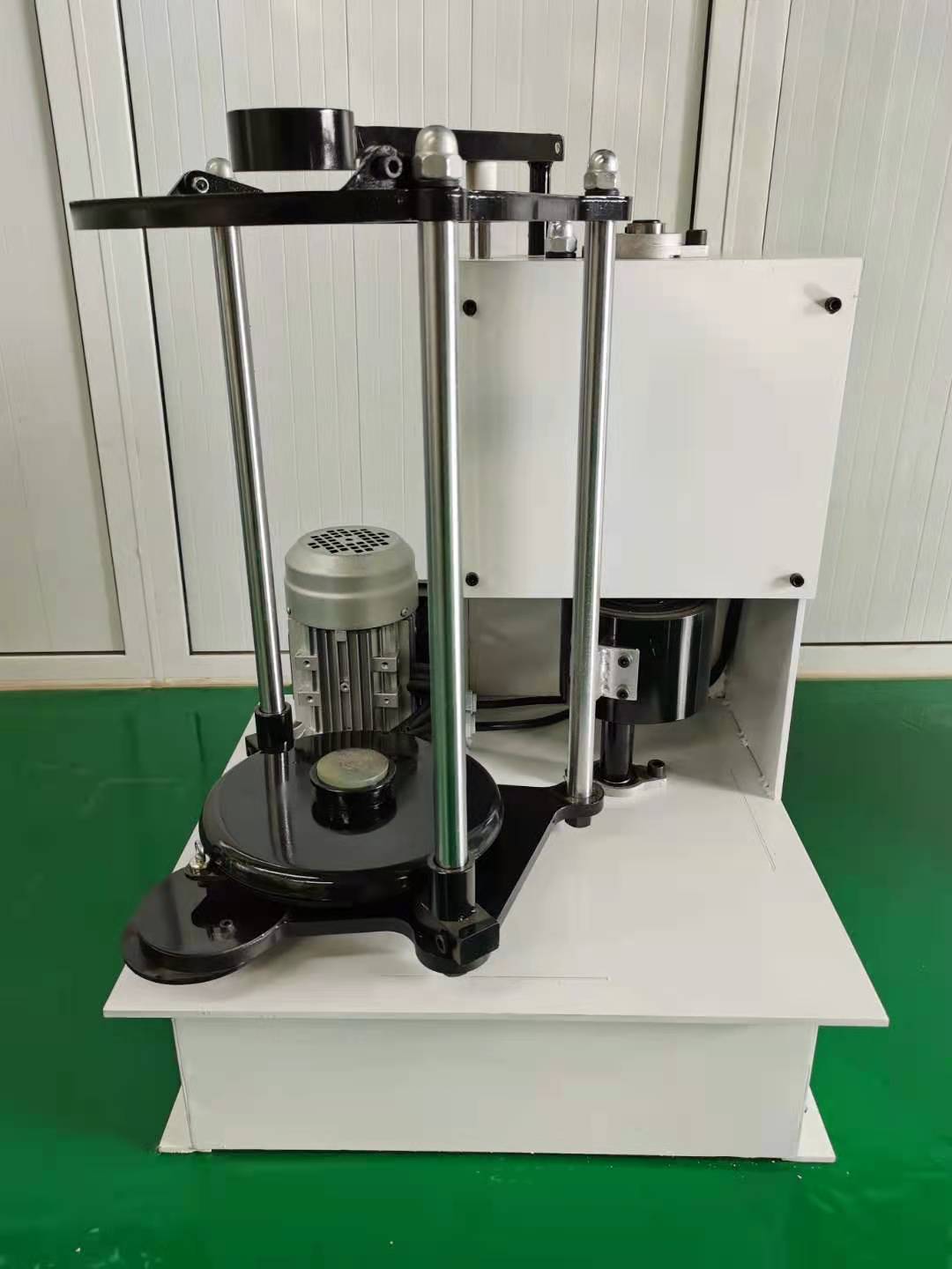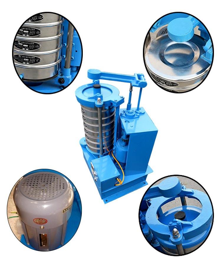 電機(jī)帶動(dòng)齒輪通過(guò)同步帶傳動(dòng)到主軸上,經(jīng)齒輪變速后主軸按要求的轉(zhuǎn)速轉(zhuǎn)動(dòng),主軸帶動(dòng)偏心輪使滑板做往復(fù)運(yùn)動(dòng),帶動(dòng)安裝在滑板托盤中的試驗(yàn)篩左右搖動(dòng),同時(shí)主軸帶動(dòng)頂桿齒輪轉(zhuǎn)動(dòng),變速后頂桿齒輪通過(guò)凸輪頂擊頂桿,頂桿使拍錘上下拍擊試驗(yàn)篩上蓋,使得試驗(yàn)篩、分樣篩中的物料往復(fù)和上下振動(dòng),使小于試驗(yàn)篩的篩面網(wǎng)孔的物料顆粒篩分進(jìn)下層試驗(yàn)篩,如此層層篩選,使每層試驗(yàn)篩內(nèi)只留相同粒度的物料。達(dá)到不同粒度的分離并確定此物料的粒度組成。