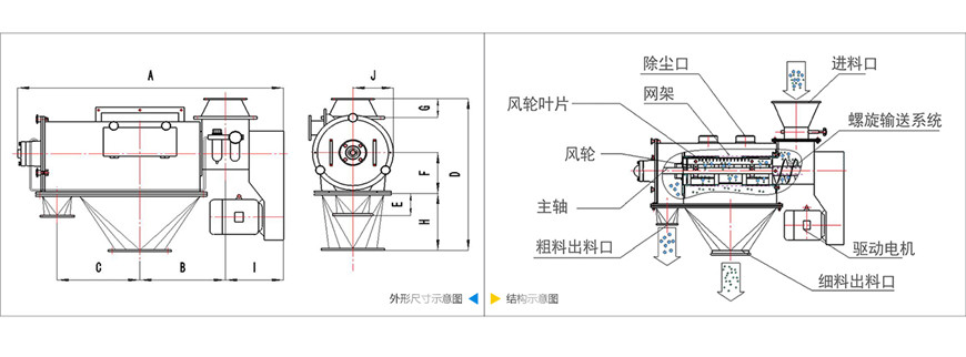本設備篩網為圓筒狀,置于機體內,物料通過螺旋輸送系統后與氣流混合、霧化進入網筒內,通過網筒內風輪葉片使物料同時受到離心力和旋風推進力,從而使物料噴射過網,過網的物料從細料排出口排出,不能過網的物料沿筒壁從粗料排出口排出,達到快速分離的目的。