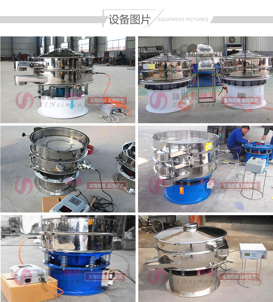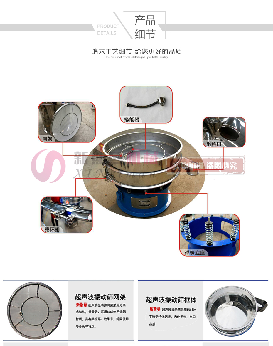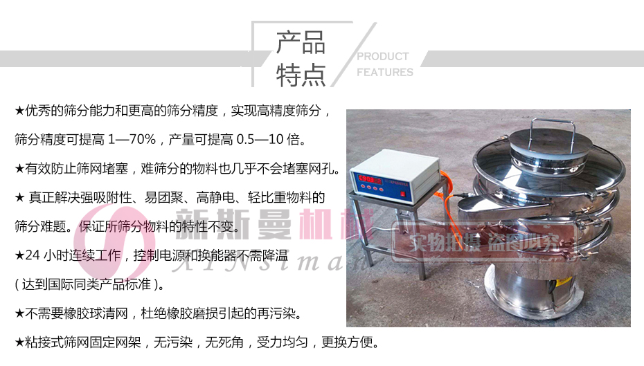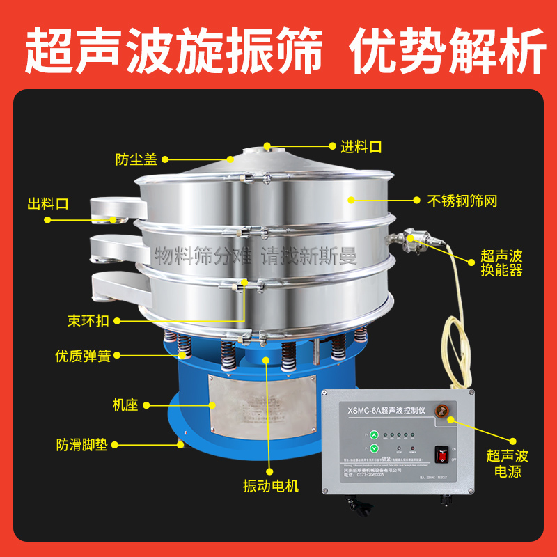 超聲波振動篩是將220V、50Hz或110V、60Hz電能轉化為36KHz的高頻電能,輸入超聲換能器,將其變成36KHz機械振動,產生的功率超聲波使篩網作高頻振動。篩網上的物料在作低頻旋振運動的同時,疊加上超聲振動,既可防止網孔堵塞,又可使篩分機提高產量和質量,從而達到快速篩分和清網的目的,使超微細粉篩分成為易事。該系統在傳統的振動篩基礎上在篩網上引入一個低振幅、高頻率的超聲振動波(機械波),以改變超微細分體的篩分性能。特別適合高附加值精細分體的用戶使用。