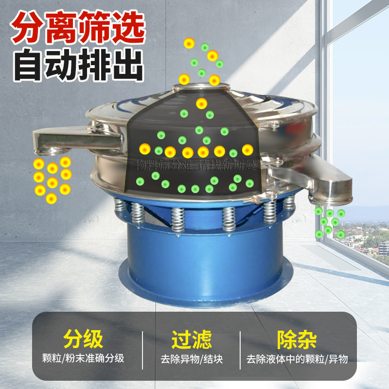 任何顆粒、粉末、粘液一定范圍內均可篩選。篩分細至500目或0.028mm, 過濾小可至5微米。分級篩選,可篩一至五層篩網,能同時進行二至六個等級的分選或過濾。